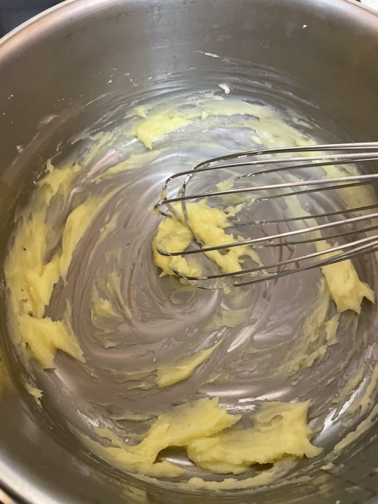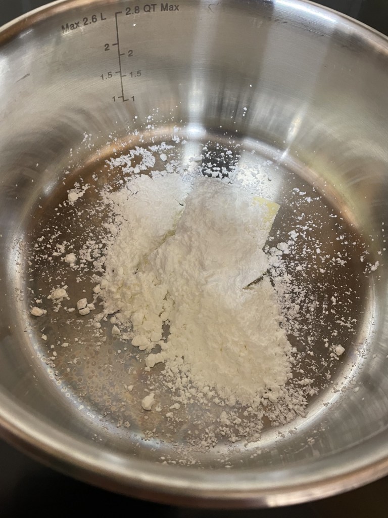 - Put a pan on the hob over a medium heat and add the butter and corn flour and whisk until the butter melted and the flour is completely mixed in. This is a Roux.