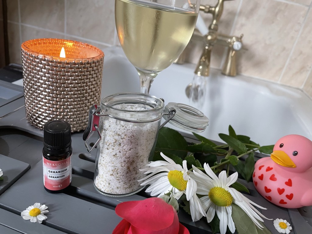 - Sprinkle in half of the bath salts (if you followed the recipe above, you will have enough for 2 baths)
