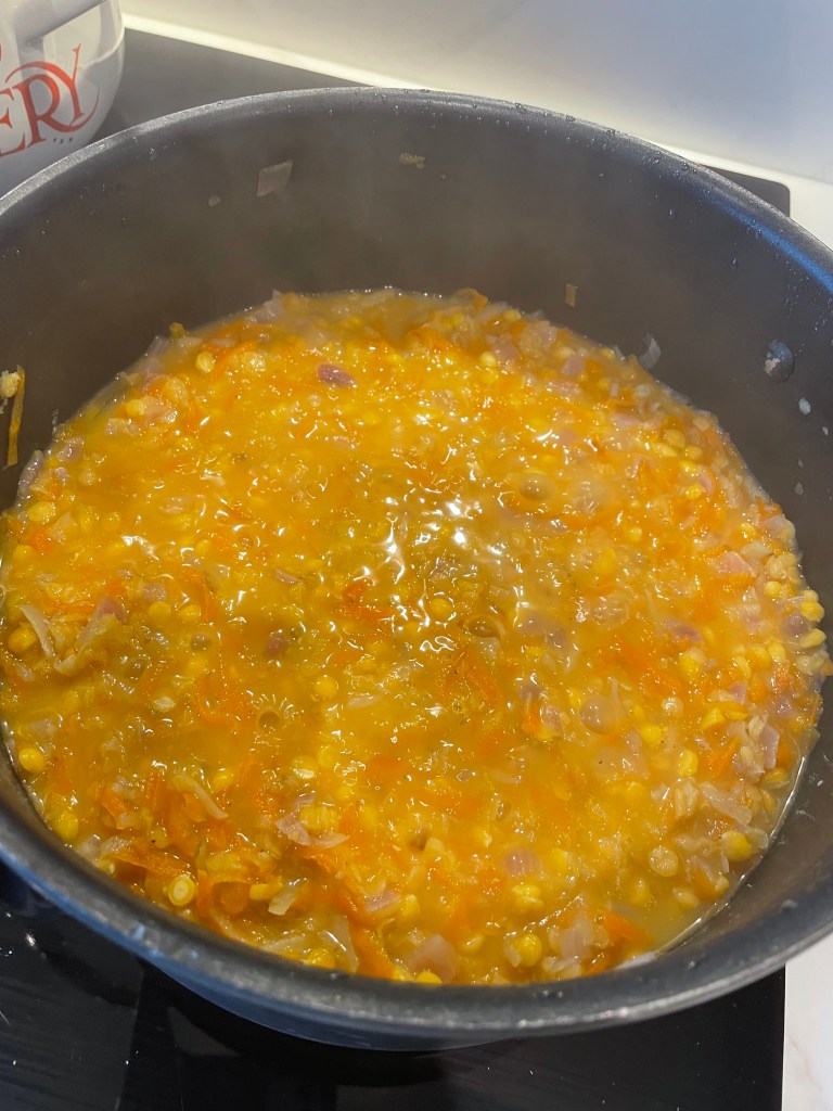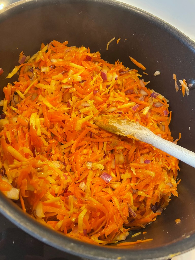 - Put the grated carrot, onion, potato and the oil in a large pan over a medium/high heat and fry off for 5-10mins, or until the onions have turned translucent and the potato and carrot have softened.