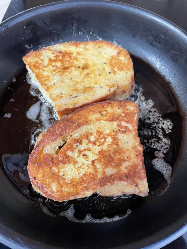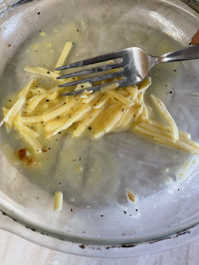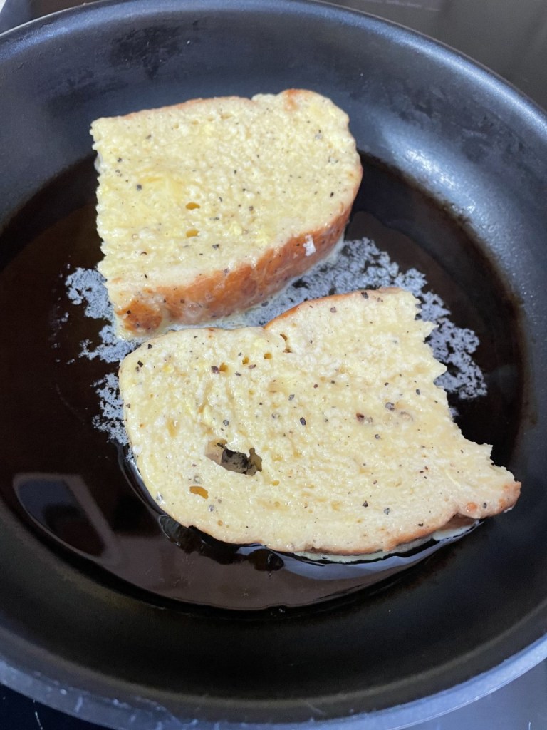 - Whilst the bread is frying, mix about a third of the cheese into the leftover egg mix.