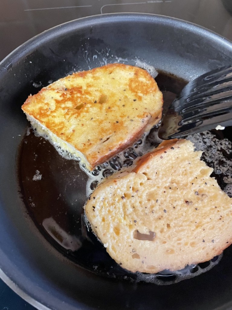 - Put a frying pan on the hob and add the oil and butter. Turn the hob to a medium/high heat, and once the butter has melted, lift the eggy bread out of the dish and into the pan.