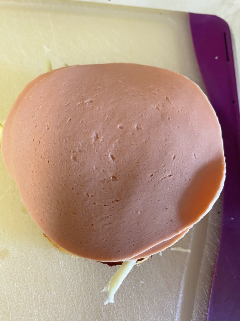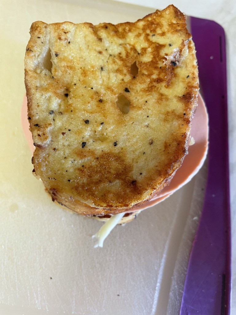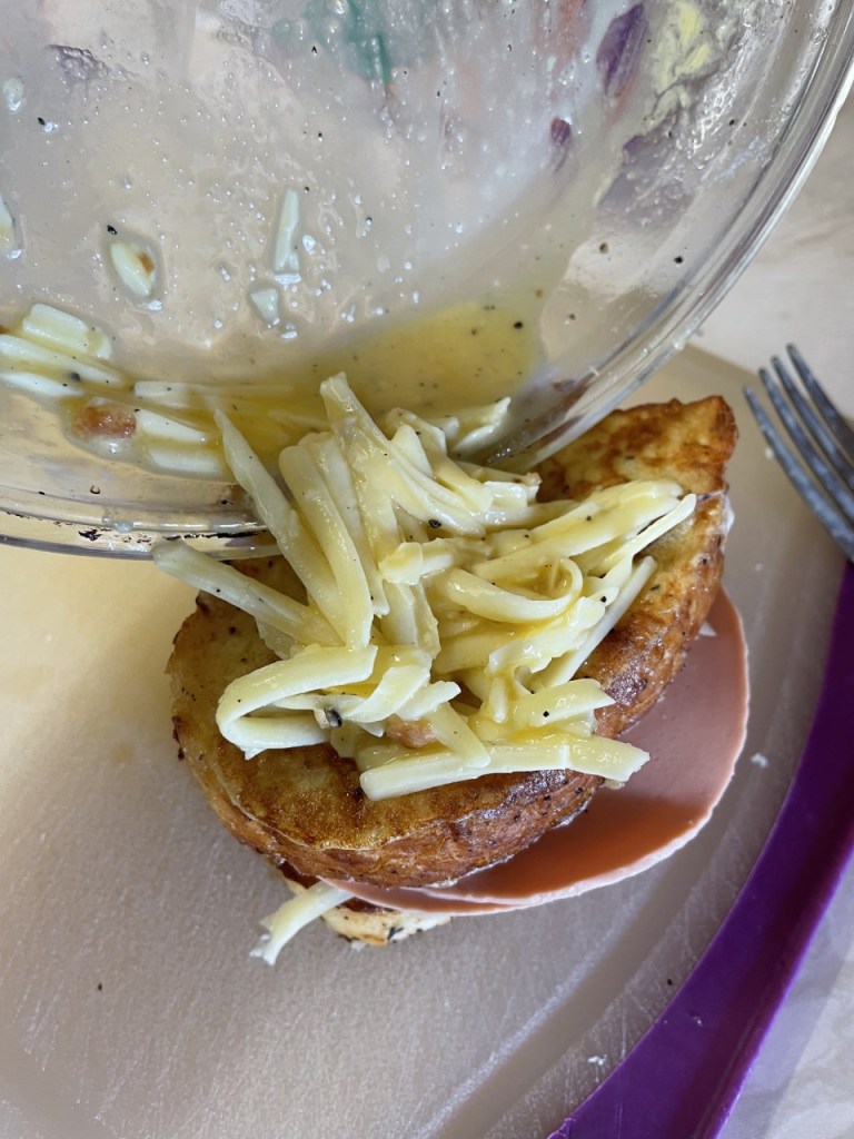 - Sandwich the rest of the cheese and the ham in between the two pieces of eggy bread, and spread the leftover egg mix, on top.
