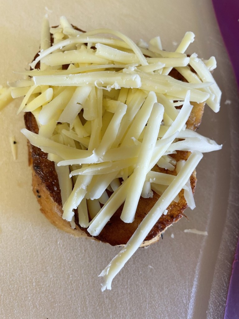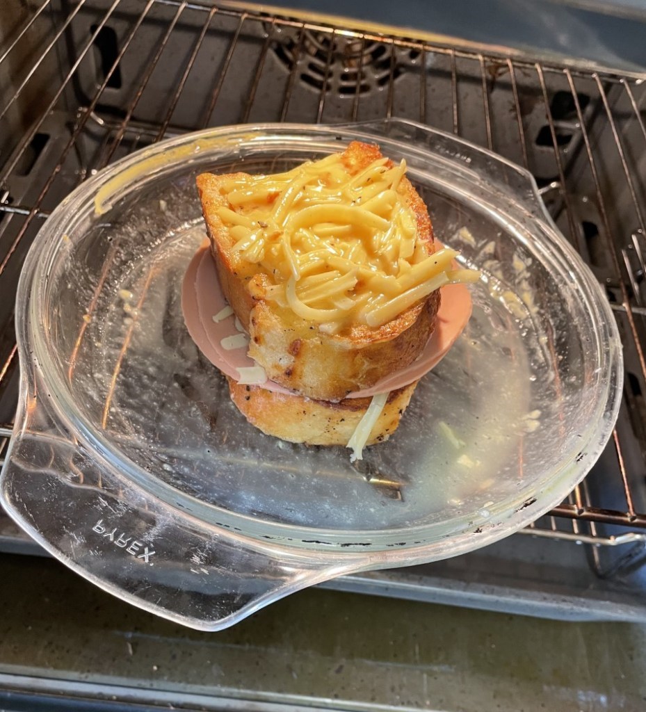 - Put the sandwich back onto the oven proof dish, and place under the grill until the cheese on top has melted and started to brown.