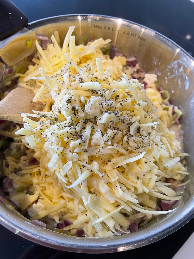 - Add the feta, cheddar, milk, herbs and black pepper.