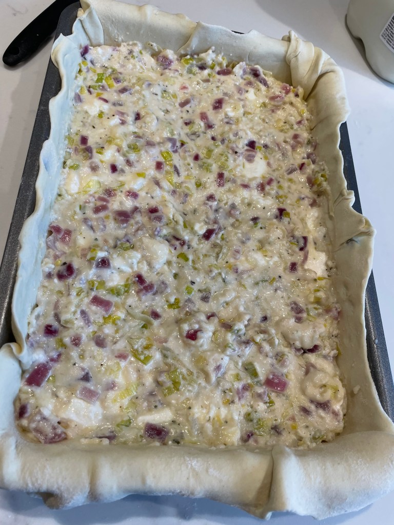 - Pour your cheese and onion mix into the pastry and spread out evenly.