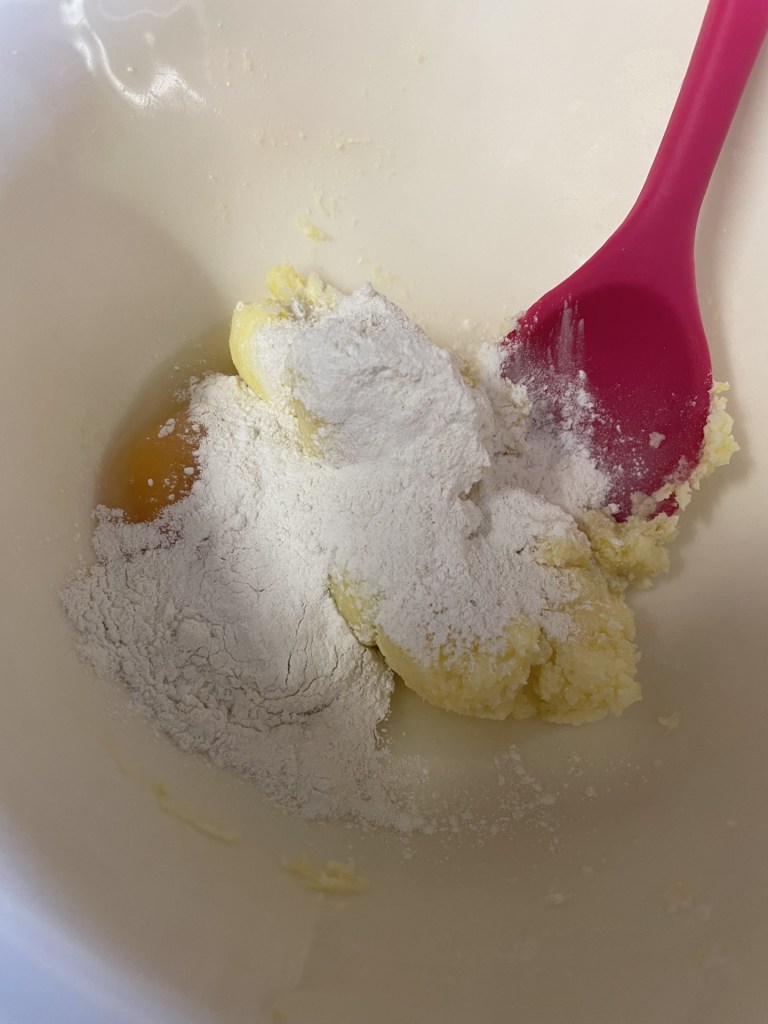 - Mix in 1 egg, along with a heaped tablespoon of flour.
