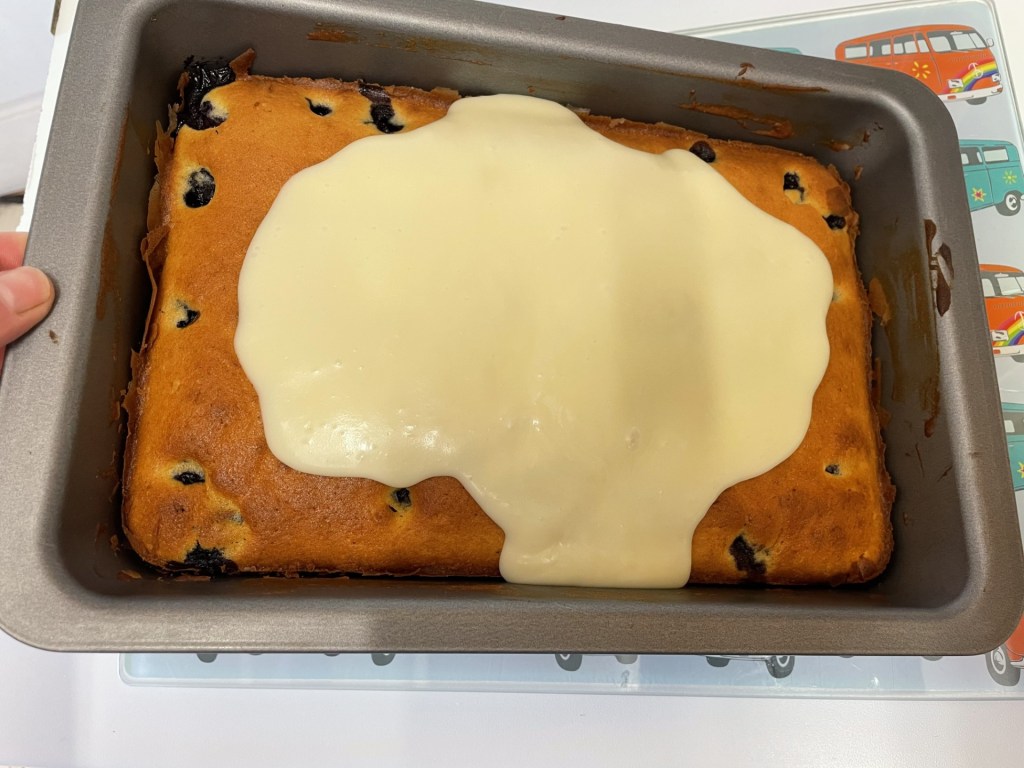 - Pour over the cake, tilting the tin to make sure it spreads out evenly.