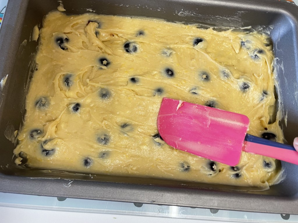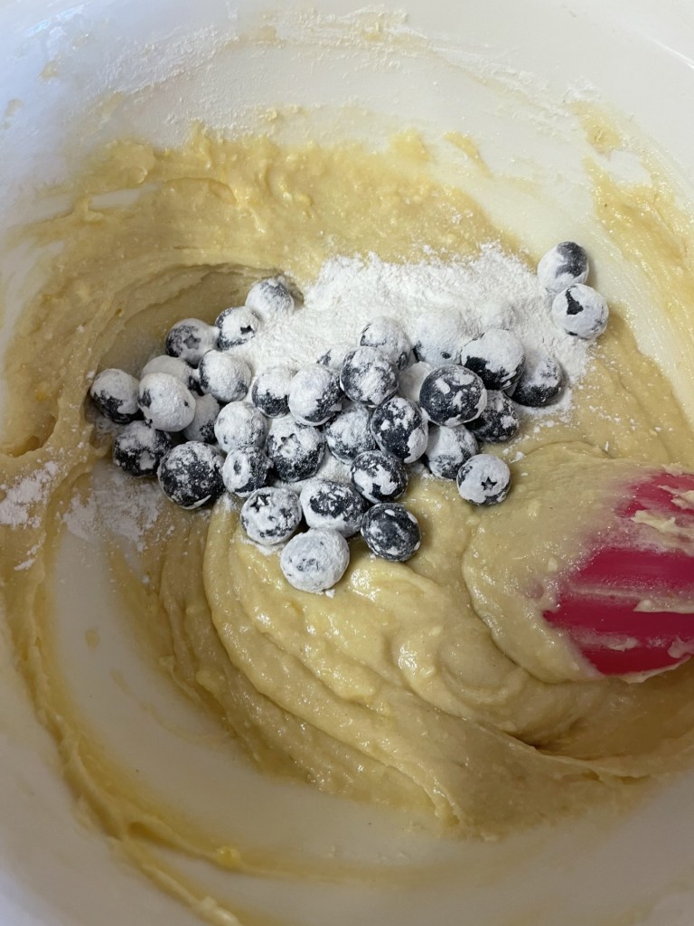 - Then tip all the flour-coated blueberries, along with the rest of the flour into the batter and mix well.
